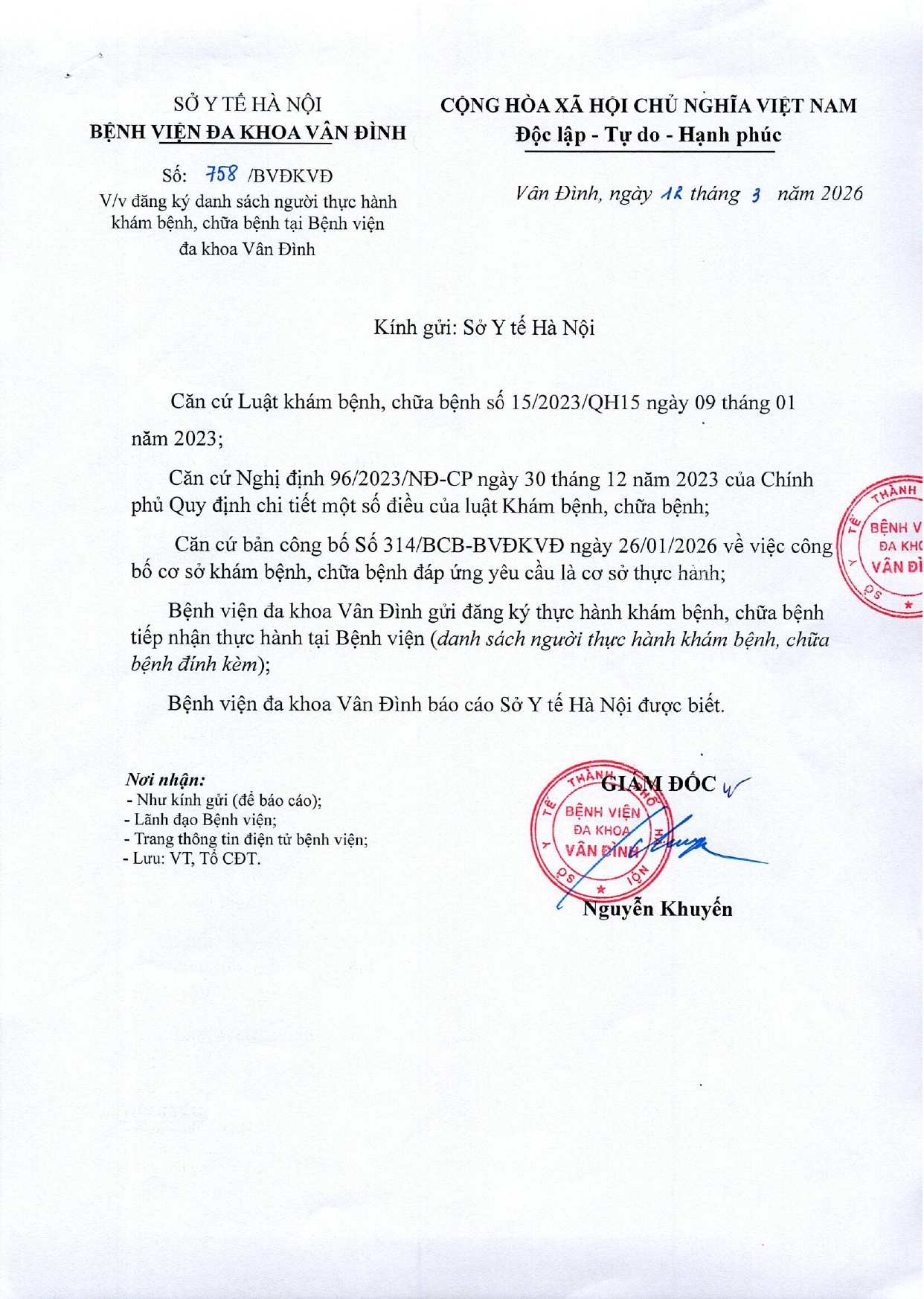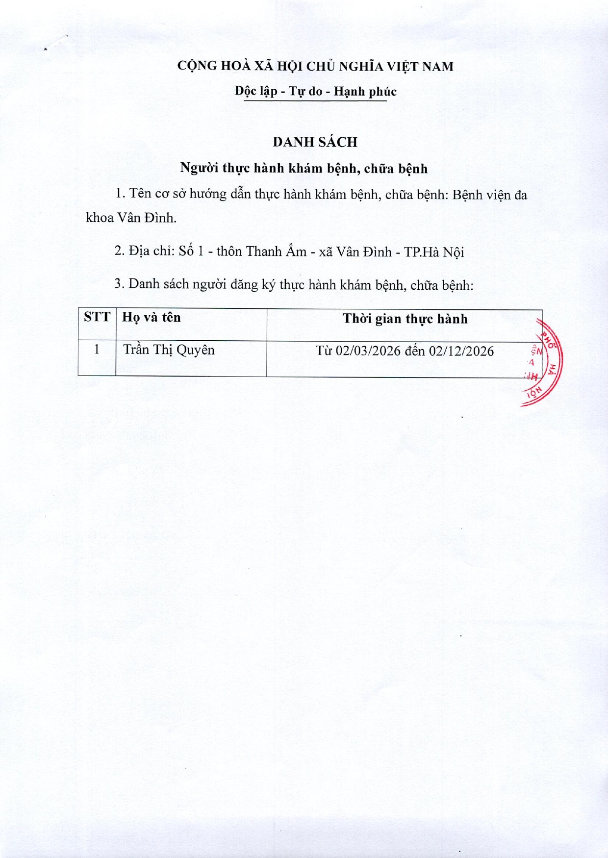 Đăng ký danh sách người thực hành khám bệnh, chữa bệnh tại Bệnh viện đa khoa Vân Đình số 758 Báo cáo danh sách xác nhận hoàn thành quá trình thực hành khám bệnh, chữa bệnh tại Bệnh viện đa khoa Vân Đình số 732