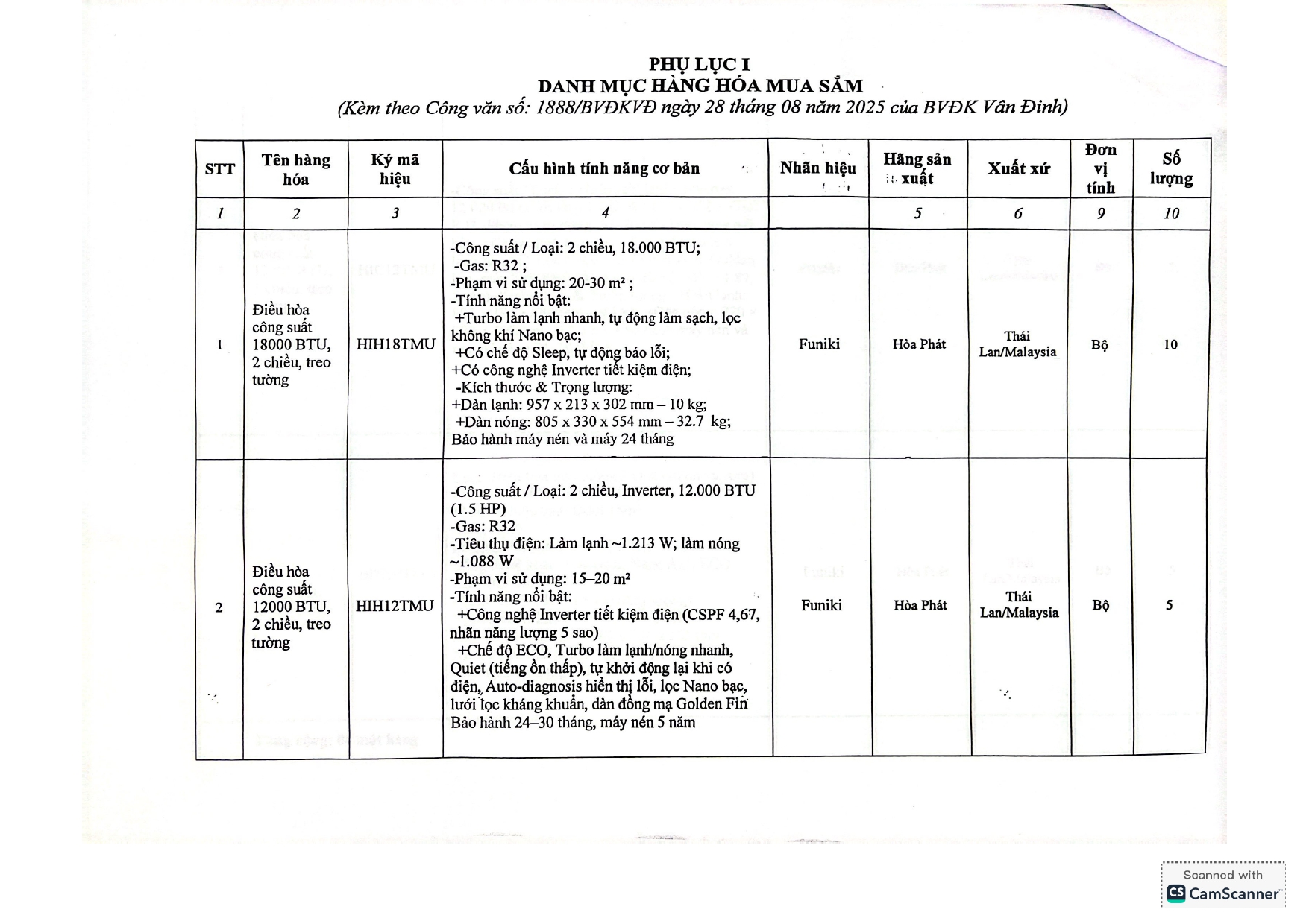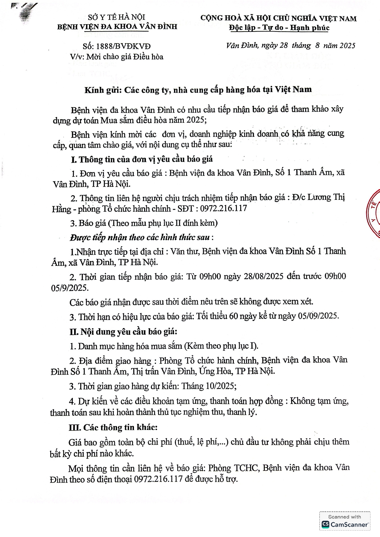 Bệnh viện đa khoa Vân Đình có nhu cầu tiếp nhận báo giá để tham khảo xây dựng dự toán Mua sắm điều hòa năm 2025;