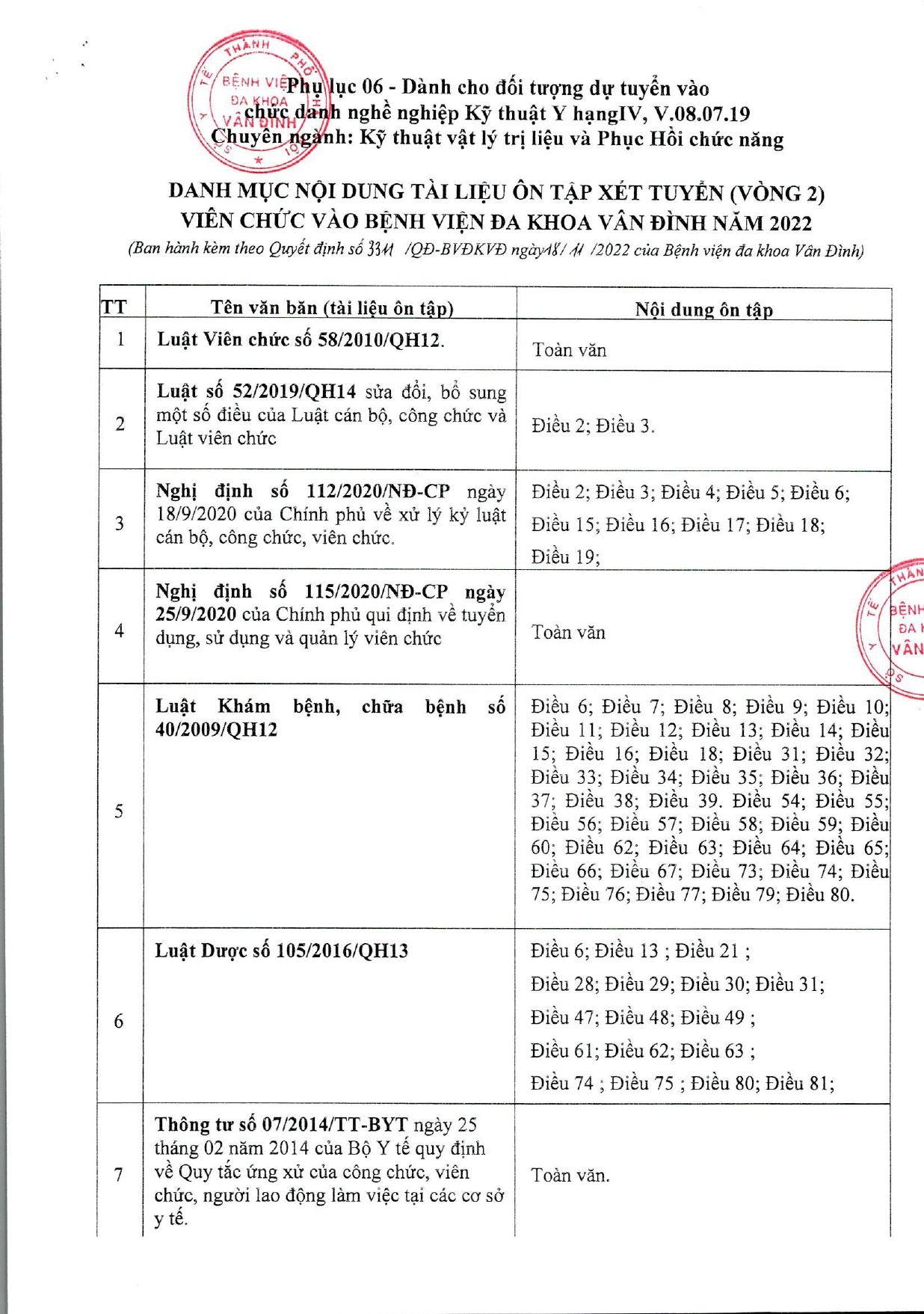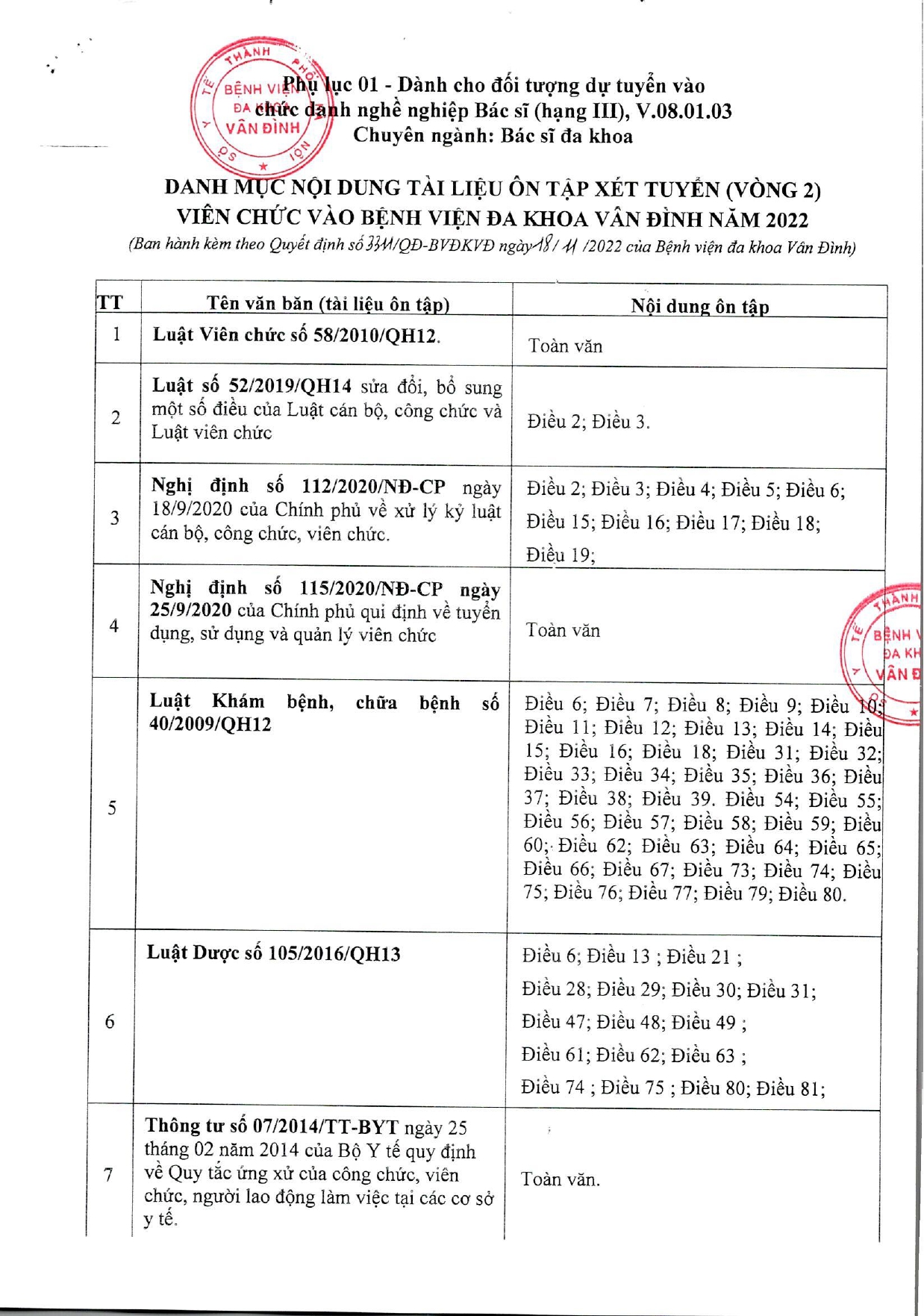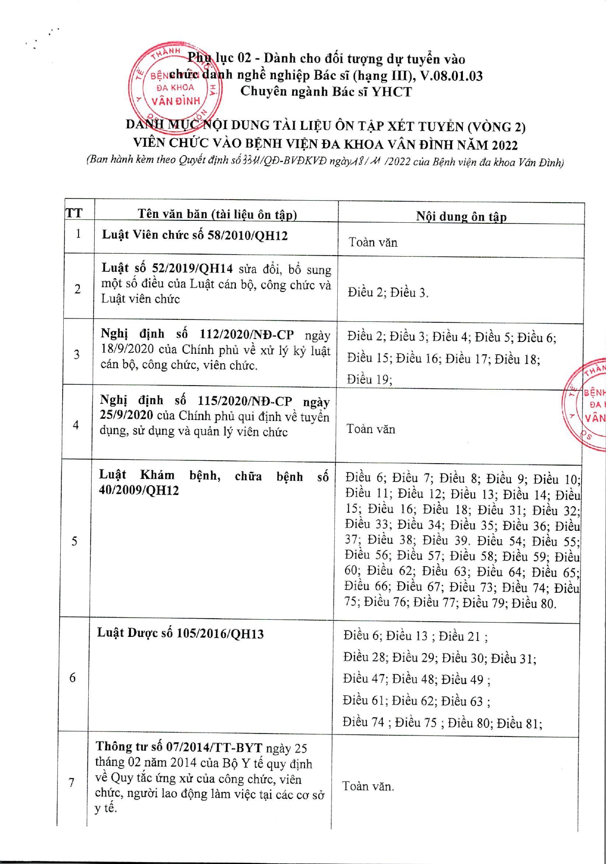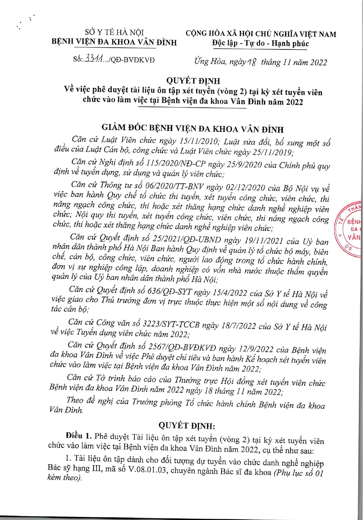 Bệnh viện đa khoa Vân Đình phê duyệt tài liệu ôn tập xét tuyển vòng 2 tại kỳ xét tuyển viên chức năm 2022. Download: QĐ 3311 Vv phê duyệt tài liệu ôn tập xét tuyển vòng 2 tại kỳ xét tuyển viên chức vào làm việc tại Bệnh viện đa khoa Vân Đình năm 2022 DANH SÁCH THÍ SINH ĐỦ ĐIỀU KIỆN THAM DỰ VÒNG 2 KỲ XÉT TUYỂN VIÊN CHỨC TRIỆU TẬP THÍ SINH ĐƯỢC THAM DỰ VÒNG 2 KỲ XÉT TUYỂN VIÊN CHỨC