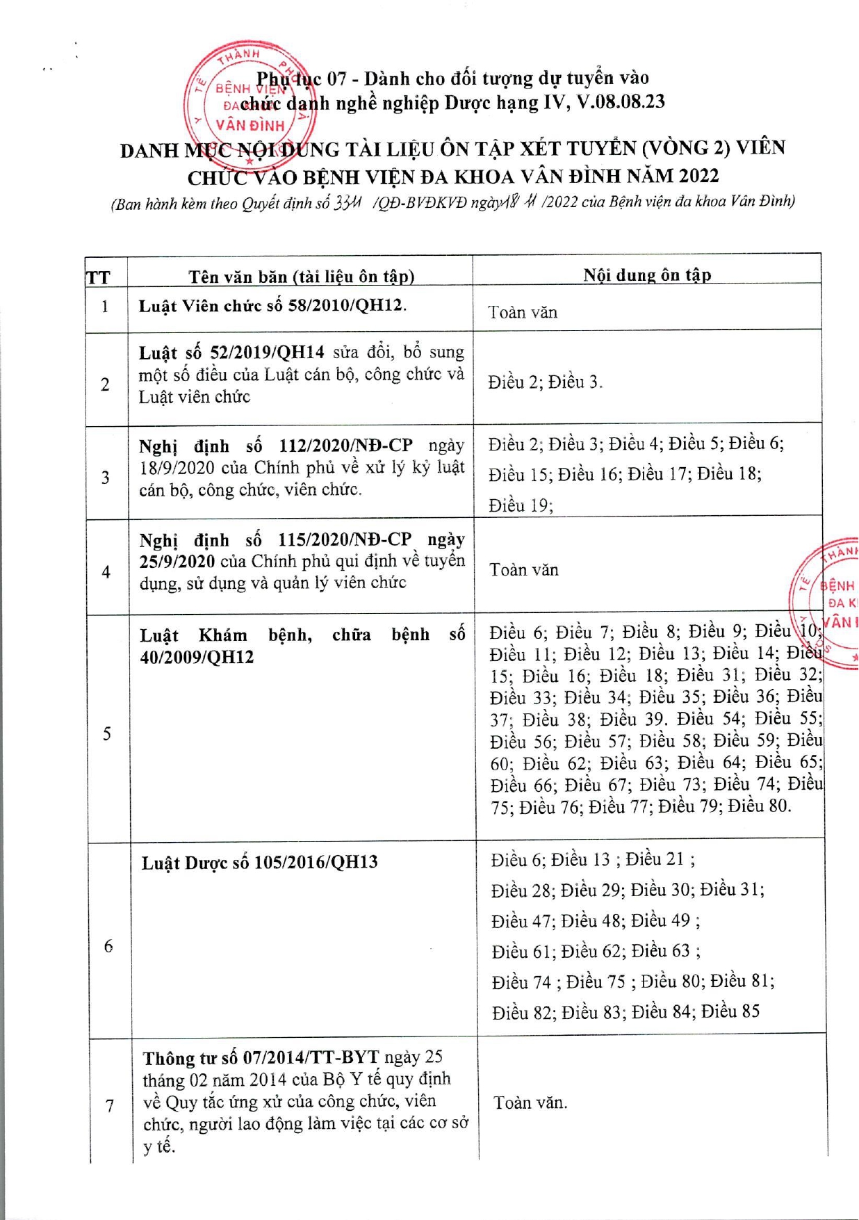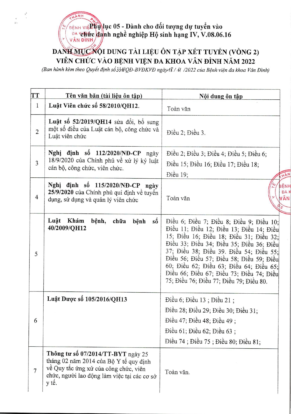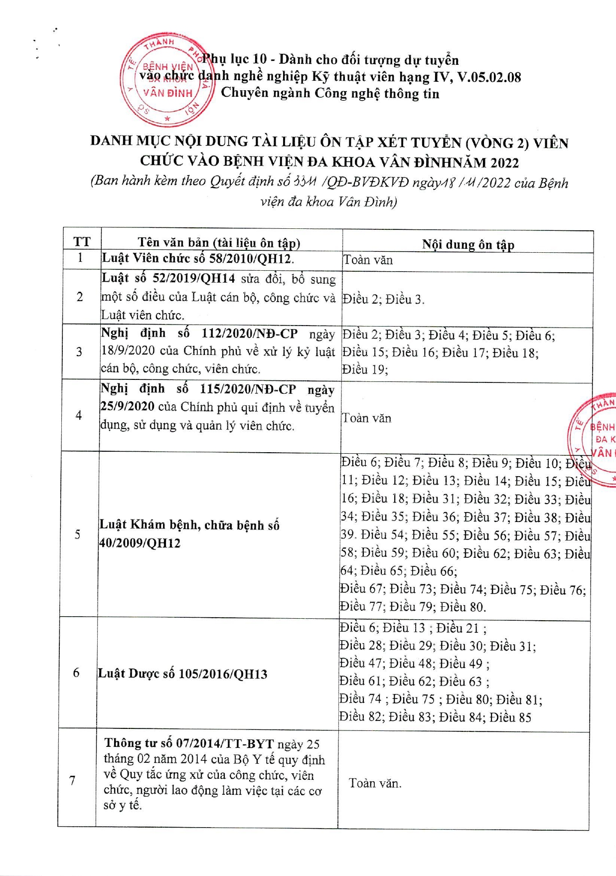 Bệnh viện đa khoa Vân Đình phê duyệt tài liệu ôn tập xét tuyển vòng 2 tại kỳ xét tuyển viên chức năm 2022. Download: QĐ 3311 Vv phê duyệt tài liệu ôn tập xét tuyển vòng 2 tại kỳ xét tuyển viên chức vào làm việc tại Bệnh viện đa khoa Vân Đình năm 2022 DANH SÁCH THÍ SINH ĐỦ ĐIỀU KIỆN THAM DỰ VÒNG 2 KỲ XÉT TUYỂN VIÊN CHỨC TRIỆU TẬP THÍ SINH ĐƯỢC THAM DỰ VÒNG 2 KỲ XÉT TUYỂN VIÊN CHỨC