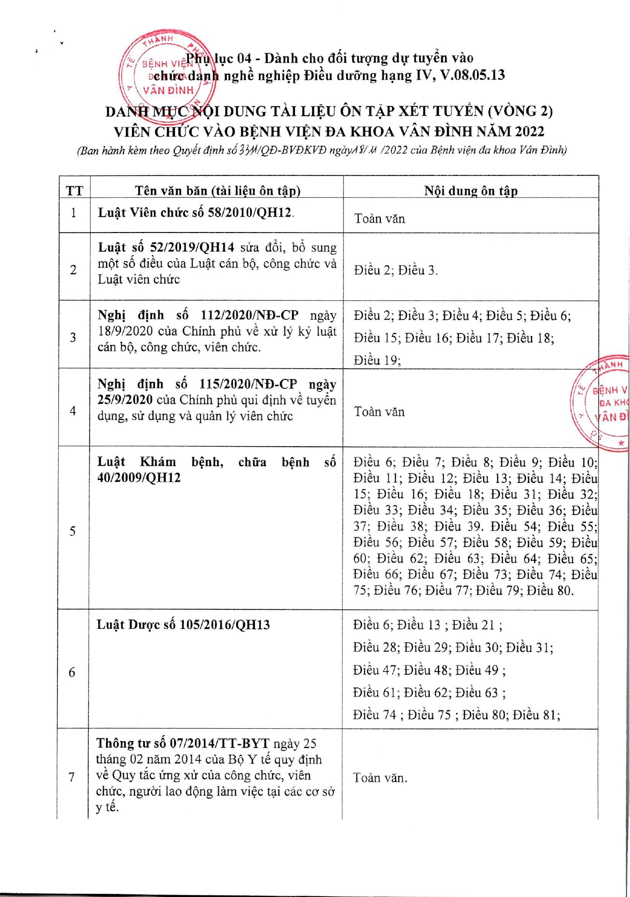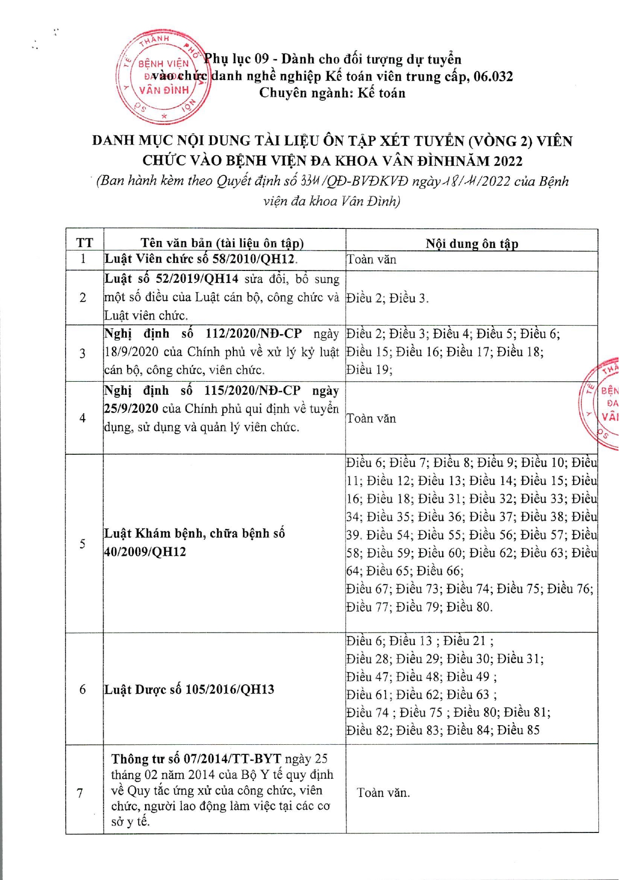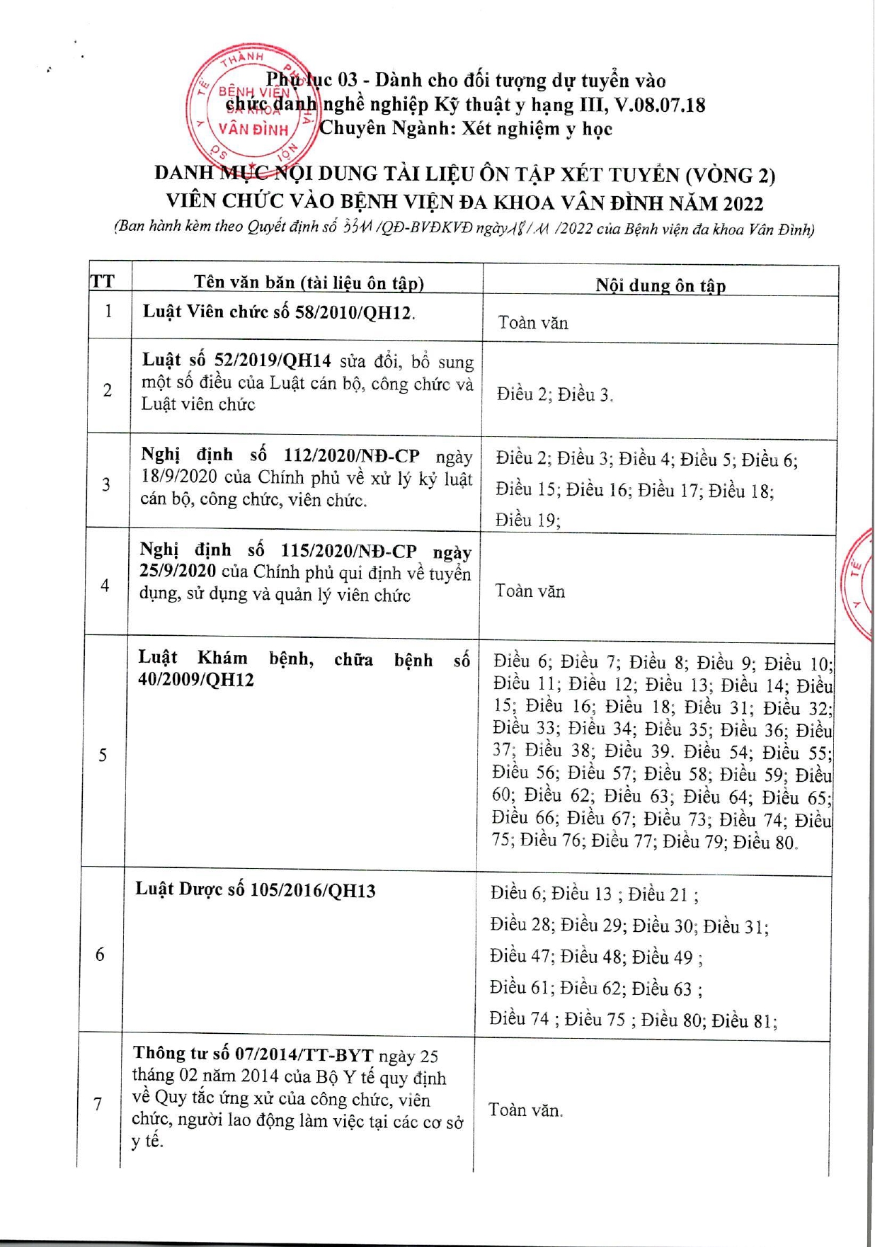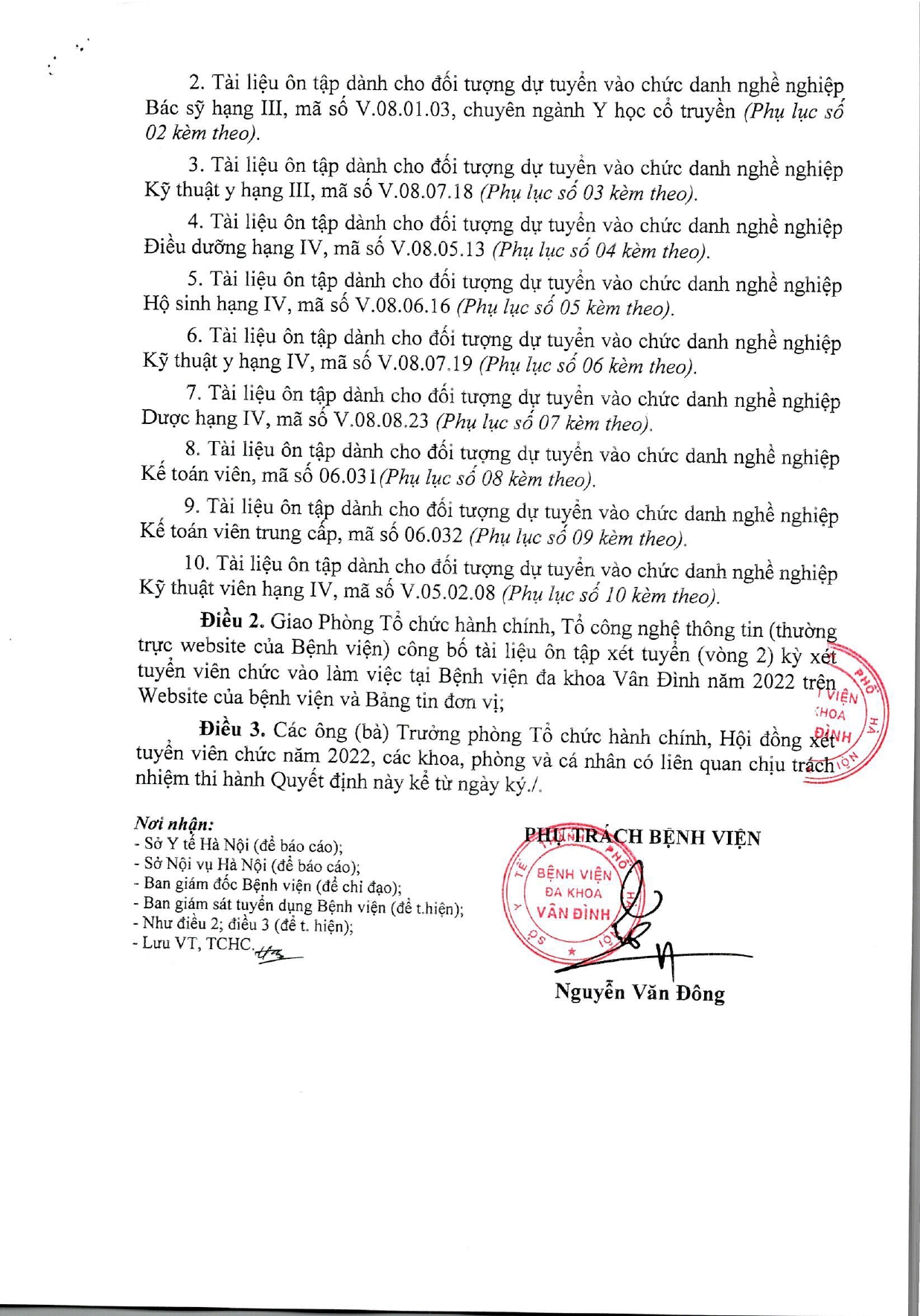 Bệnh viện đa khoa Vân Đình phê duyệt tài liệu ôn tập xét tuyển vòng 2 tại kỳ xét tuyển viên chức năm 2022. Download: QĐ 3311 Vv phê duyệt tài liệu ôn tập xét tuyển vòng 2 tại kỳ xét tuyển viên chức vào làm việc tại Bệnh viện đa khoa Vân Đình năm 2022 DANH SÁCH THÍ SINH ĐỦ ĐIỀU KIỆN THAM DỰ VÒNG 2 KỲ XÉT TUYỂN VIÊN CHỨC TRIỆU TẬP THÍ SINH ĐƯỢC THAM DỰ VÒNG 2 KỲ XÉT TUYỂN VIÊN CHỨC