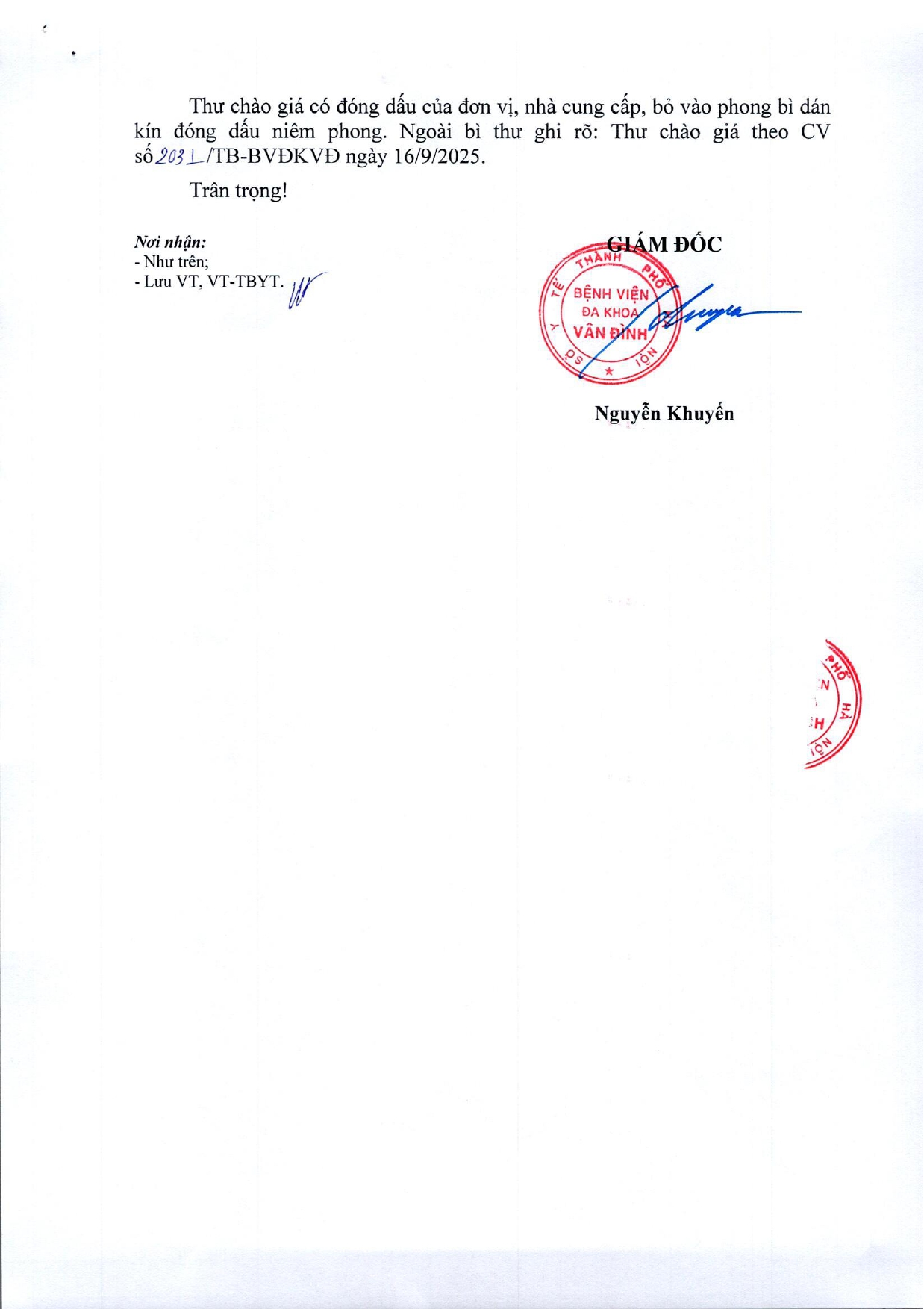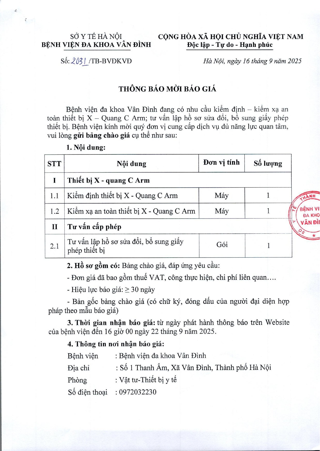 Bệnh viện đa khoa Vân Đình đang có nhu cầu kiểm định – kiểm xạ an toàn thiết bị X-Quang C Arm; tư vấn lập hồ sơ sửa đổi, bổ sung giấy phép thiết bị. Bệnh viện kính mời quý đơn vị cung cấp dịch vụ đủ năng lực quan tâm, vui lòng gửi bảng chào giá cụ thể như sau: