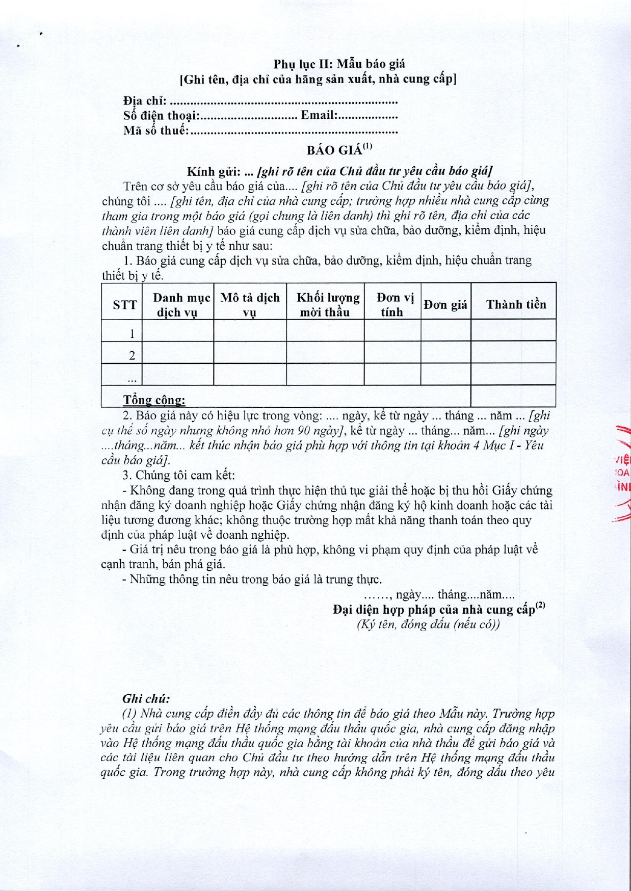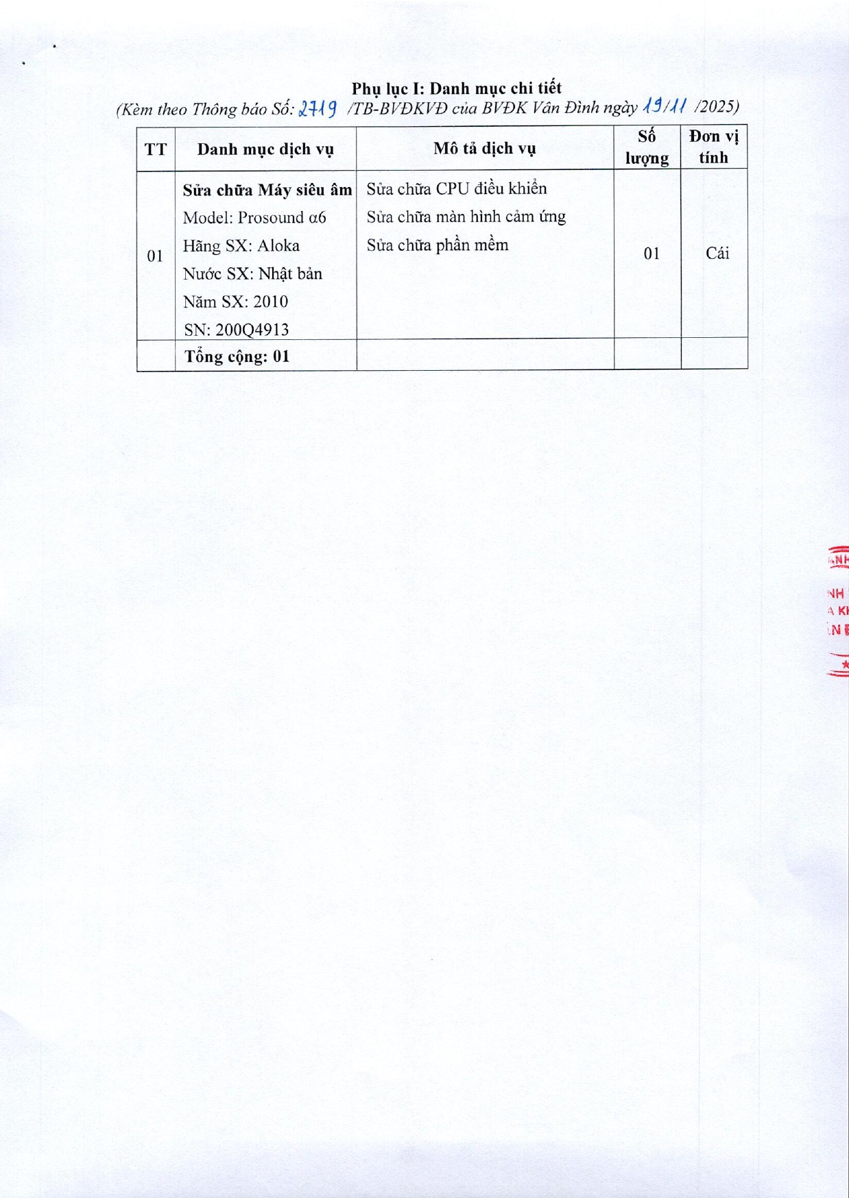 Bệnh viện đa khoa Vân Đình có nhu cầu tiếp nhận báo giá để tham khảo, xây dựng giá gói thầu, làm cơ sở tổ chức lựa chọn nhà thầu cho gói thầu: Sửa chữa máy siêu âm với nội dung như sau: