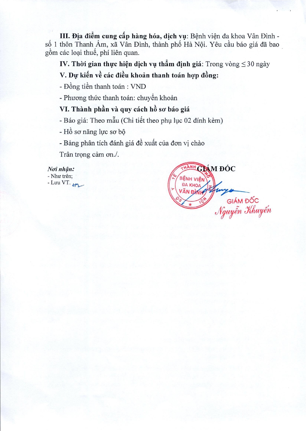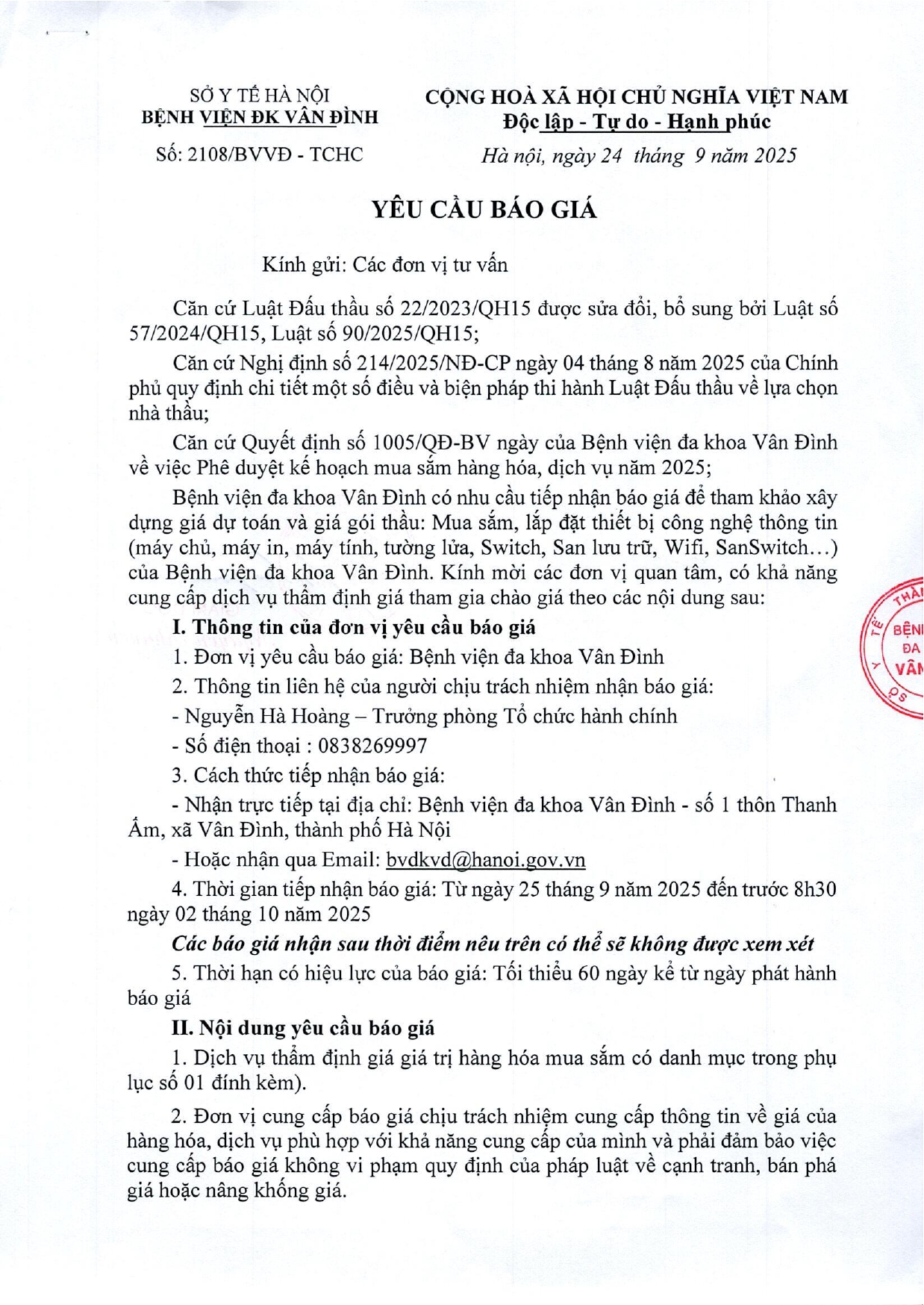 Bệnh viện đa khoa Vân Đình có nhu cầu tiếp nhận báo giá để tham khảo xây dựng giá dự toán và giá gói thầu: Mua sắm, lắp đặt thiết bị công nghệ thông tin(máy chủ, máy in, máy tính, tường lửa, Switch, San lưu trữ, Wifi, SanSwitch…) của Bệnh viện đa khoa Vân Đình. Kính mời các đơn vị quan tâm, có khả năng cung cấp dịch vụ thẩm định giá tham gia chào giá theo các nội dung sau: