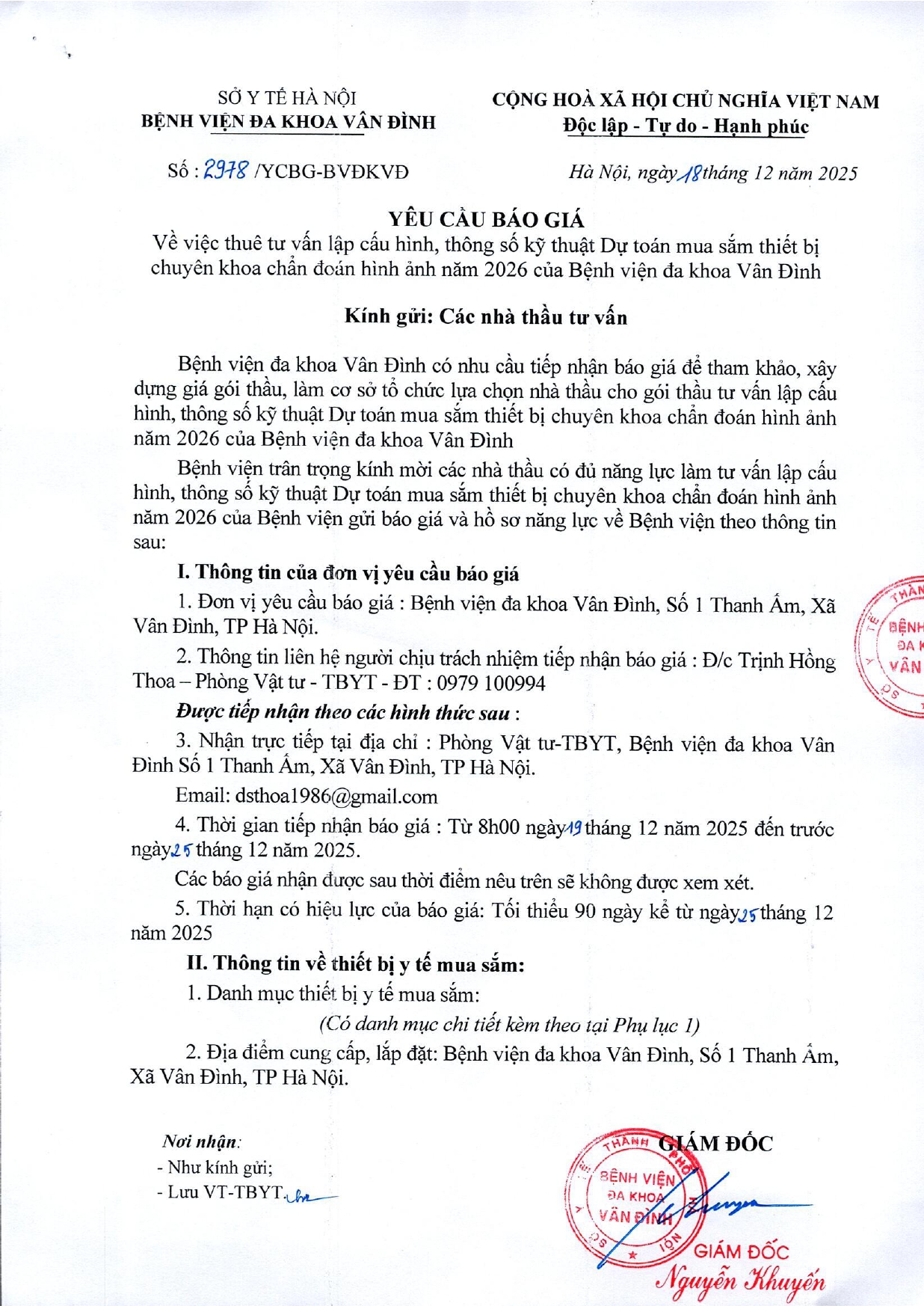 Về việc thuê tư vấn lập cấu hình, thông số kỹ thuật Dự toán mua sắm thiết bị chuyên khoa chẩn đoán hình ảnh năm 2026 của Bệnh viện đa khoa Vân Đình